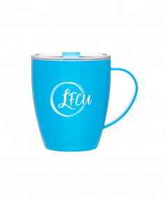 12 oz double wall 18/8 stainless steel thermal mug with copper vacuum insulation, clear acrylic push-on lid, and matching swivel; Hand wash recommended; Do not microwave; 4-7/16" h x 4"w (4-7/8 with handle) ; 355mL.
